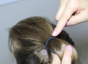 (1) まずはポニーテールの位置で髪の毛をまとめゴムで留めます。