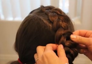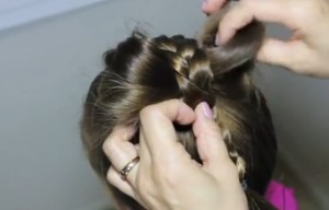 (3) 毛先の髪の毛を三つ編みし、真ん中の部分にします。