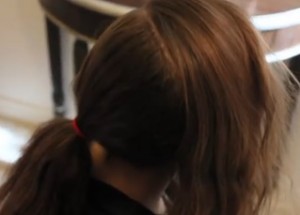 (5) 残りの髪の毛と合わせて、右の耳の後のあたりで髪の毛を一つにまとめます。